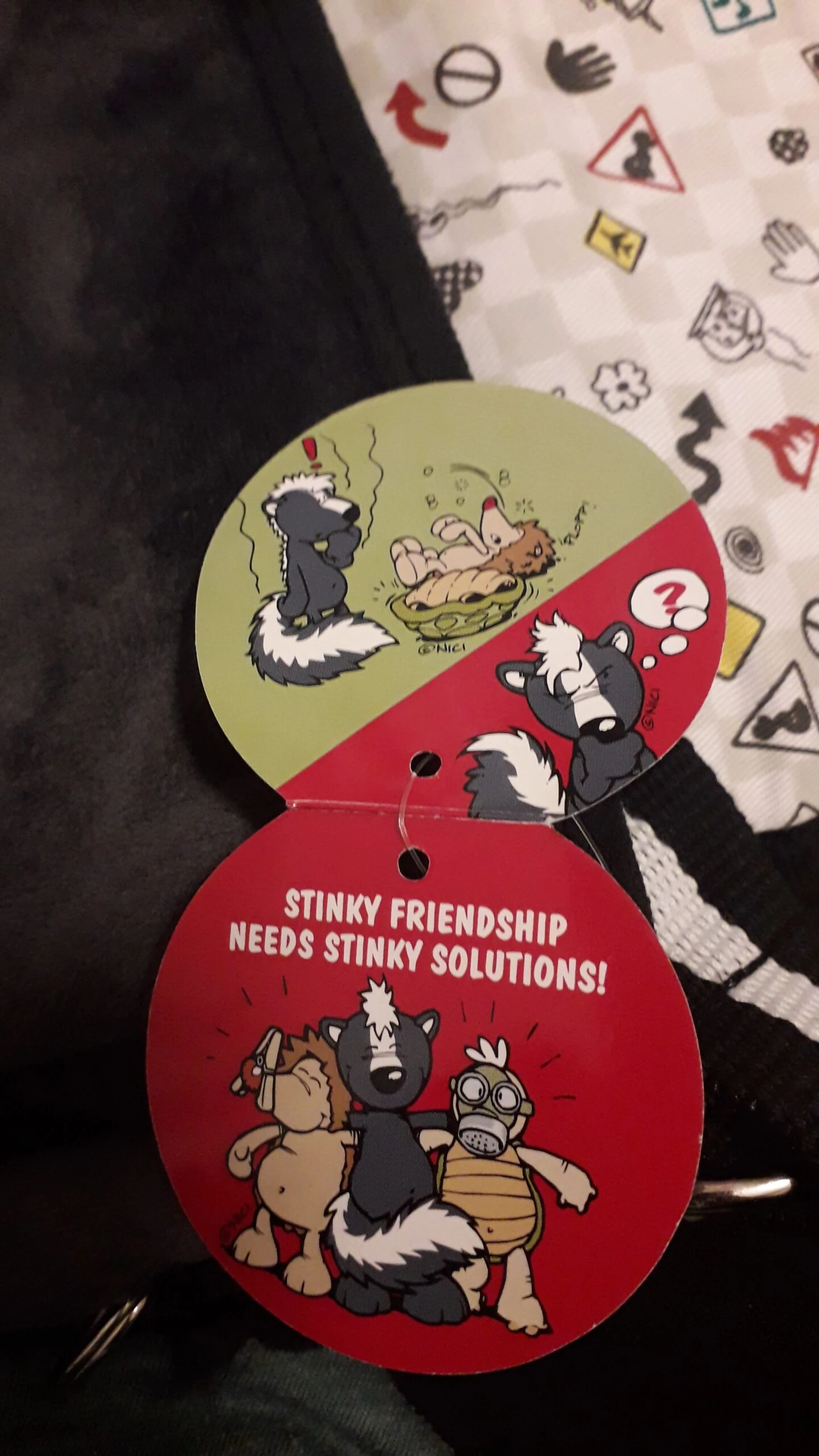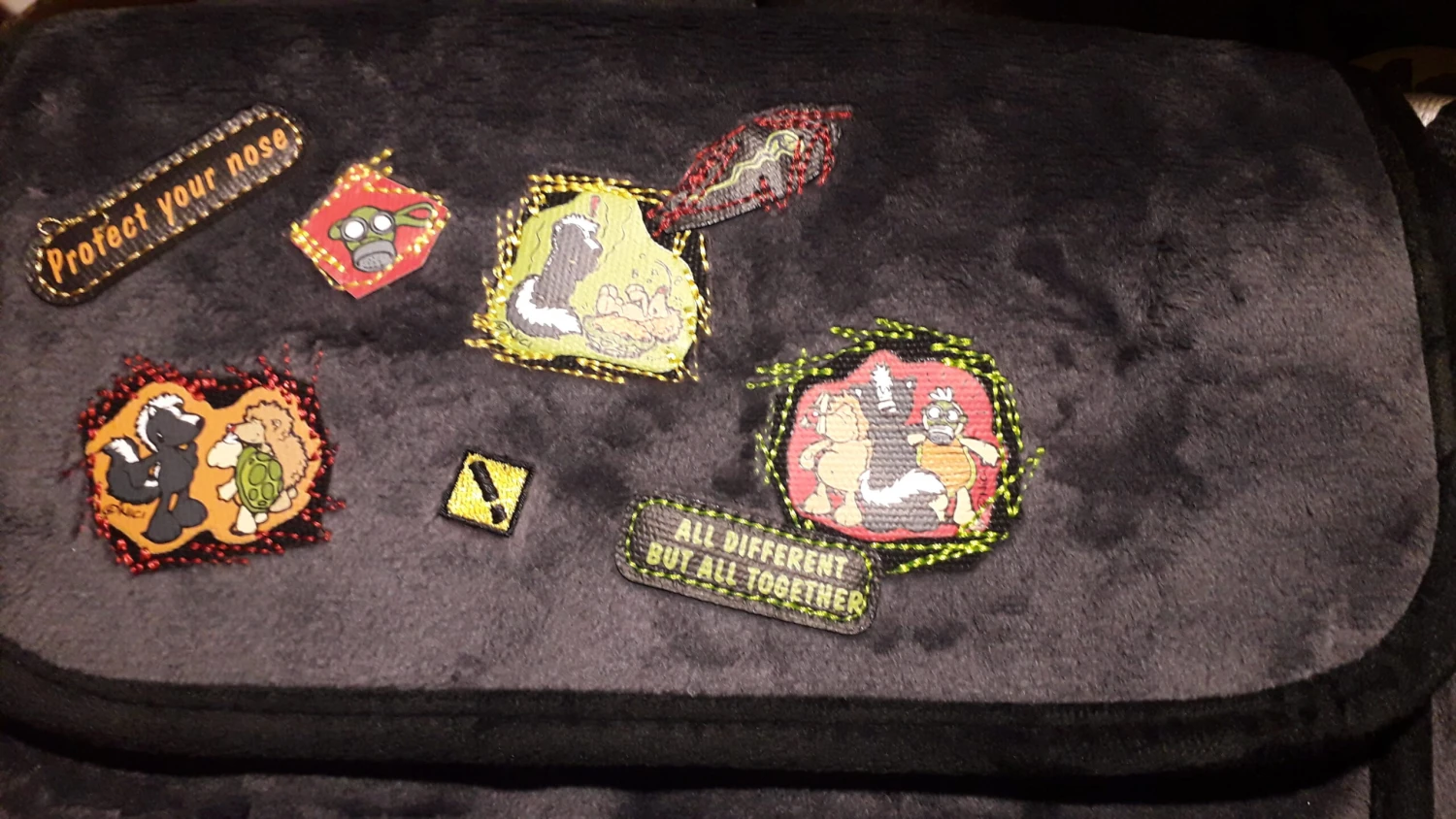 Niedliche Umhängetasche, ein absoluter Blickfang. Mit kleinem Stinktierschwänzchen als besonderer Hingucker und aufgenähten Patches auf der Vorderseite.