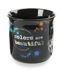 schwarze Tasse aus Porzellan mit bunter Botschaft